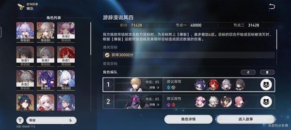 下半感觉史瓦罗血好厚,还有小怪抢神君,最高就只打了三万四左右,景元还算高配吧,0+1,面板75/207,2+2+2,神君确实出伤太慢了,加上小怪一直出很难伤害全给史瓦罗,看水友大部分也都能三万左右,就不多赘述,主要讲上半思路,毕竟上半打满了下半都不用碰boss也能满星嘛。
