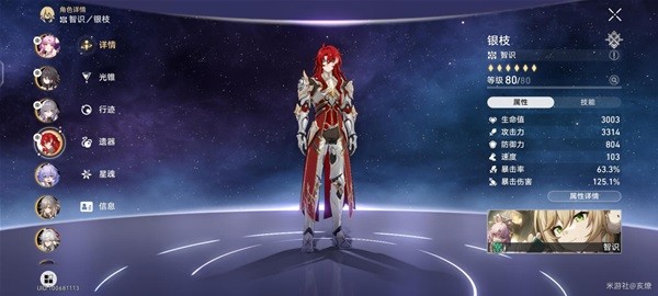 先放上银枝面板,四物理二停转,63/125已经很亲民了吧,和平也是精一,今天才刚刚从1级拉起来的(拿燃料刷智识钥匙升)
