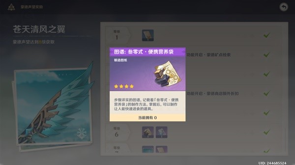 二、蒙德声望:5级便携营养袋(一键回血)>3级捕风瓶(产生风场)>6级口袋锚点;