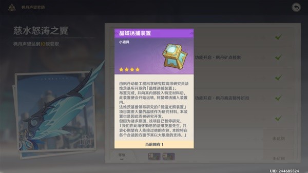 四、枫丹声望:3级晶蝶诱捕装置(每周获取15晶蝶);