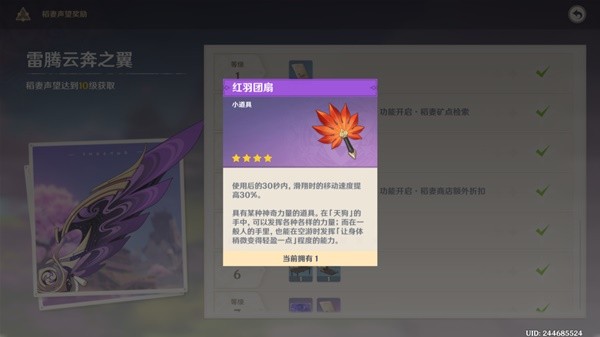 五、稻妻声望:3级红羽团扇(飞翔加速)。
