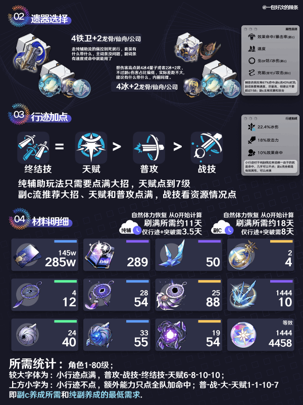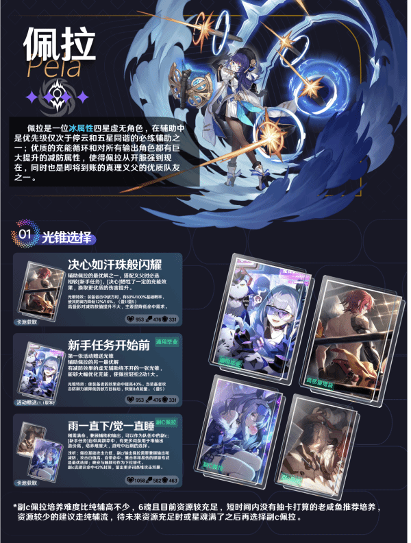 佩拉养成主要分为只堆速度、生存和命中的纯辅流,以及需要堆双暴攻击,培养难度更大的副c流,下面就是一图流,直接抄作业即可。