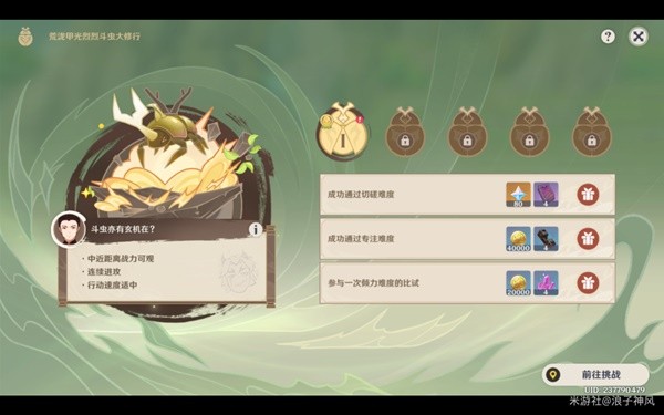 ●每关斗虫挑战均有「切磋」、「专注」、「倾力」3个难度。挑战开启后,「切磋」和「专注」难度会解锁。成功挑战「专注」难度后才可解锁「倾力」难度。