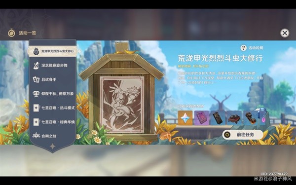 经过前面两天的活动,旅行者们对这个斗虫活动应该很熟悉了。今天的活动依然只有1项,难度有所提升。今天的活动内容是: