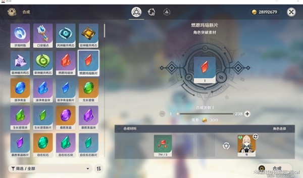 ②合成台通过消耗一定素材合成获得