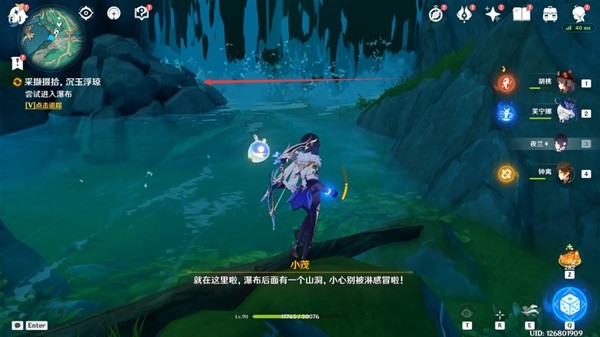 2,跟随小茂来到瀑布,打碎石块,通过升降石板进入秘境。