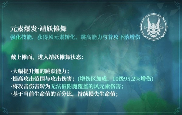 提高靖妖傩舞状态下的普攻下落增伤,天赋等级很低时可以降低烧血幅度。