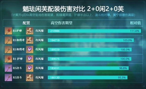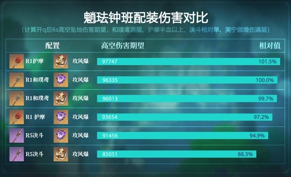 以下是魈珐钟班、魈珐芙闲两种配队使用常见的武器圣遗物在满BUFF时的对单伤害期望对比: