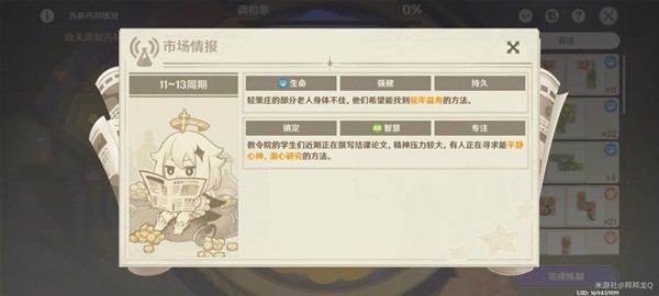 上架我另外一个潜心研究应该是智慧,专注,镇定。就上架这些词条的药剂,因为我炼金等级又给了钱,顺便也升了一下培育效率。然后药材研析解锁,可以放入药材直接获取经验,不用像以前慢慢放置升级。