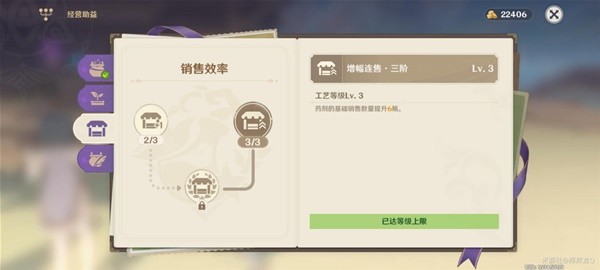 关于经营助力,我个人喜欢优先升炼制效率和销售效率,后升培育效率。因为不喜欢概率,所以炼制效率右边多升了一级,并且我们也需要炼制经验。