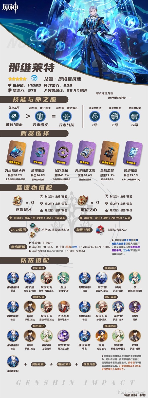 ⑥那维莱特自身伤害充足,其配队主要围绕“尽可能多地触发不同水元素反应(至多3种)”。目前的主要配队是水伤直伤输出队伍,如白万芙特、那芙钟琴、那钟万达等;还有依靠重击附着规则配合组成的“燃蒸玩法”,如那维莱特/钟离/纳西妲/香菱(此队香菱尽可能高地堆叠元素充能效率)。
