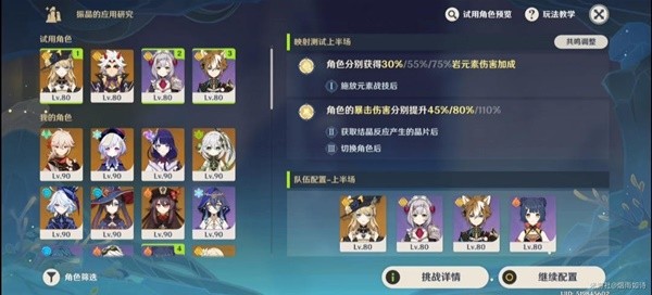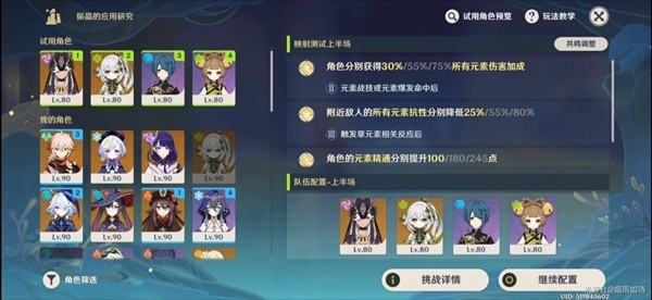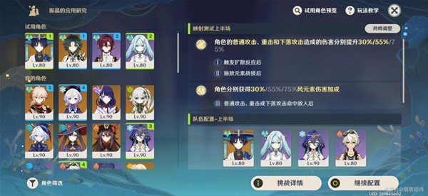挑战中,我们需要用角色凑两个配队(挑战存在试用角色)