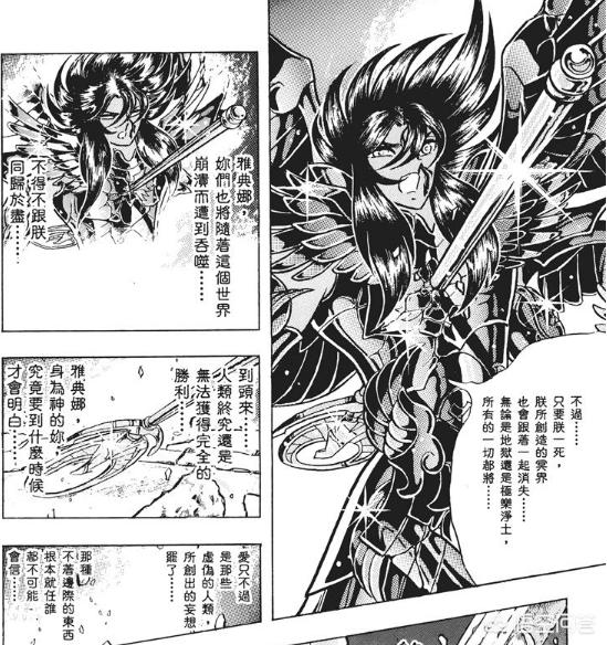1986年版的车田正美《圣斗士星矢》漫画中,冥王篇的结局是冥王被雅典娜的胜利权杖穿心,星矢被哈迪斯之剑击穿,最后随着极乐净土的轰鸣,雅典娜和剩下的一辉、瞬、紫龙、冰河都没能回到地上世界。
