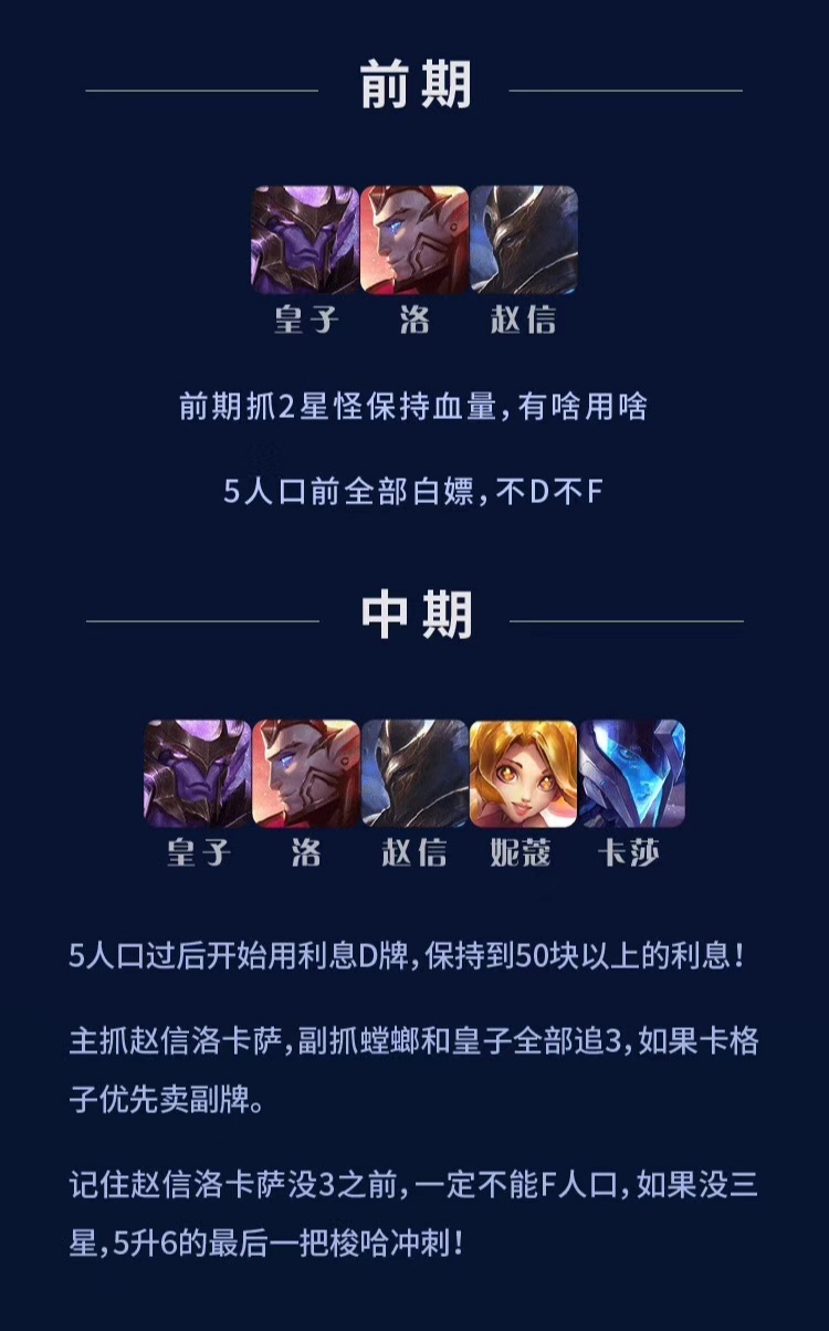 这套阵容在前期就是卖血流套路,因为皇子,螳螂,卡莎,洛,赵信都是低费卡片,如果运气好的话,很有可能会直接免费获得到二星,当然就算运气不好,刷不到自己想要的英雄,这个时候我们也不要点击升人口和刷新,这套阵容的发力点在中期,前期卖血获得更好的合适是非常重要的。