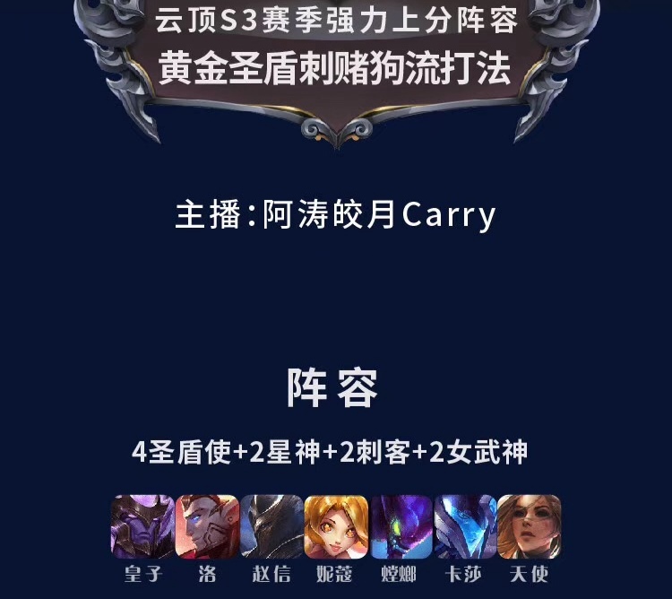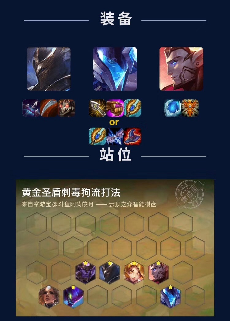 前言:云顶之弈目前已经进入到了s2赛季的默契,官方将会在26号左右更新到s3赛季,估计所有的玩家都已经熟悉了,s3赛季的种种英雄在新赛季会有着诸多的更新,比如新的英雄,新的基本,新的玩法,新的地图,今天就给大家推荐一个云顶之弈s3赛季的全新套路,由主播阿涛皎月Carry研究出来的,和之前的刺客玩法非常的相似,同样是赌刺客的英雄,被命名为黄金圣盾四刺狗流!