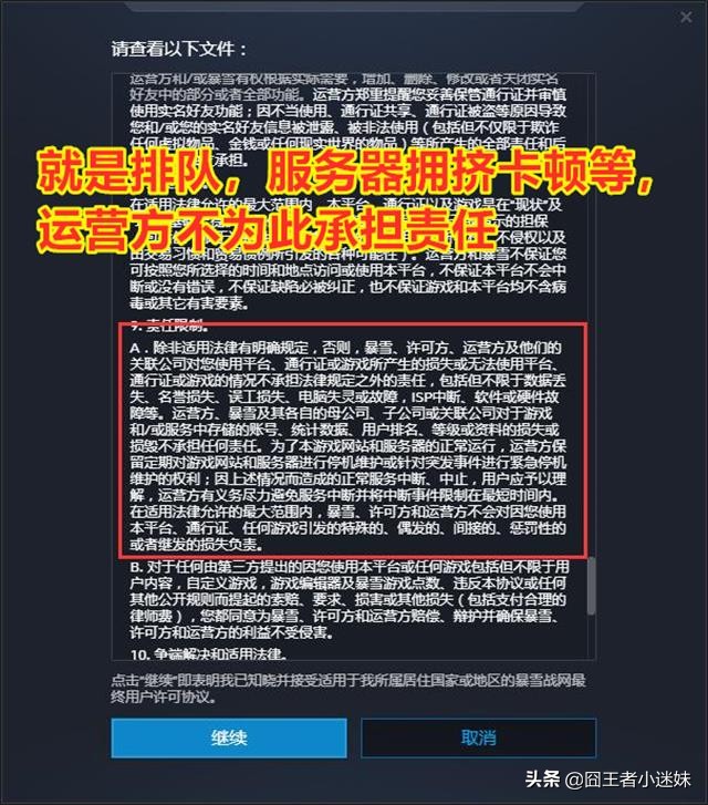 其中第一个高亮标识的增补条款就是:以后暴雪和网易作为运营方,将不会对于服务器的排队,拥挤,卡顿和突发事件造成的损失承担任何责任。其实这就是一个为以后大型错误做的法律条文上的补漏,万一以后因为上述原因出现了暴雪和网易不可承受的损失的时候,这一条就刚好适用。其实这一条对于普通玩家来说,并不会造成任何实际损失。这只是暴雪和网易对于不可承受损失的最后一步棋罢了,像补偿免费天数等这都是小打小闹,暴雪和网易该赔还是会赔的。普通玩家不必在意和介怀。