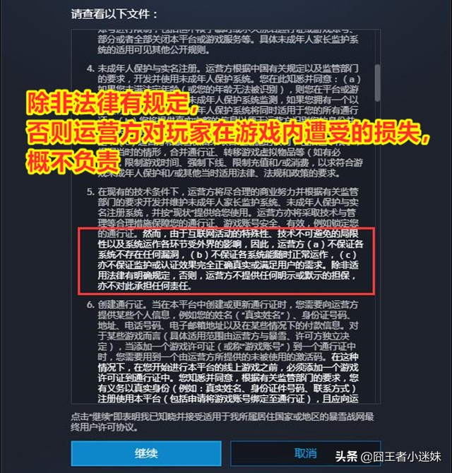 在得到免费七天游戏的消息后,3月18日登陆暴雪战网的玩家们,相信都发现了一点。那就是暴雪在战网登陆的时候,更新了用户协议,不点同意是无法登陆战网进入游戏的。囧王者和绝大多数玩家一样,对于这种普适性的协议一般都是直接拉到最后,点选“同意”“继续”的。但是这一次囧王者工会的朋友提醒我去看一看具体的条款,说其中高亮标识的一些细节有点东西。因此我只能开另外一个战网账号,专门去看了一看高亮标识的具体条款。