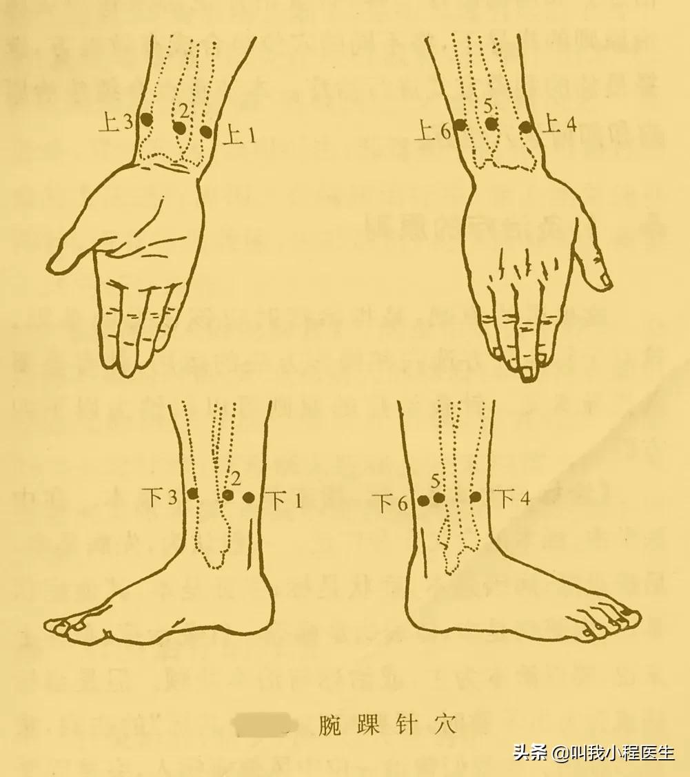 腕踝针是在手腕关节和足踝关节附近操作的针灸方法,针刺要求针体只能在浅筋膜层,不能产生酸胀痛的针感,否则就是针刺过深,需要调整进针深度。下面是腕踝针取穴。