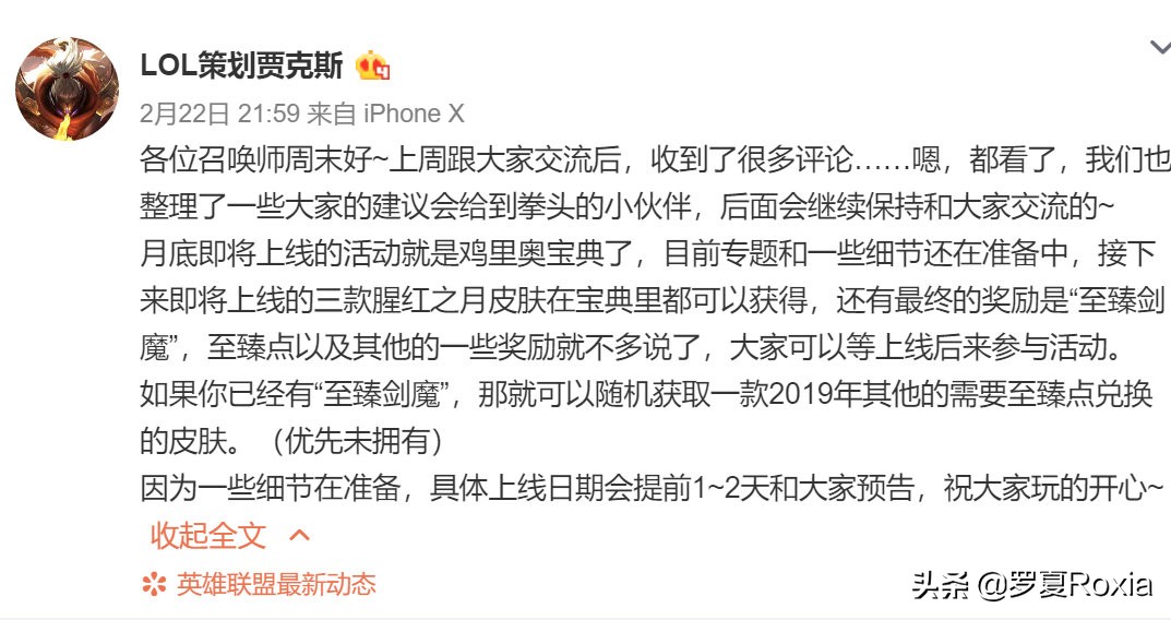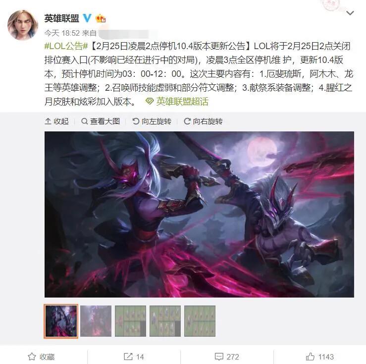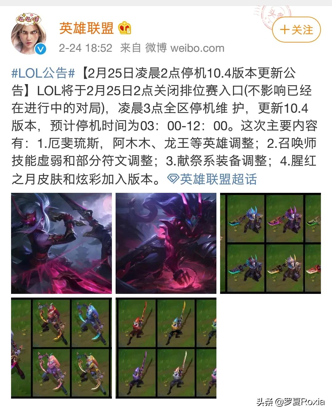 就在今天下午的七点钟左右,英雄联盟的官方也是公布了这么一条微博,在微博中说道25号的凌晨两点就会开始更新,而这次直接将会更新10.4版本,而在3点钟的时候就将全区停机维护,所以各位小伙伴今晚恐怕是没办法通宵上分了。而这次的更新,除了对于一些英雄的调整、召唤师技能虚弱和部分符文的调整之外,其实我最关注的还是这次腥红之月新皮肤的上线。