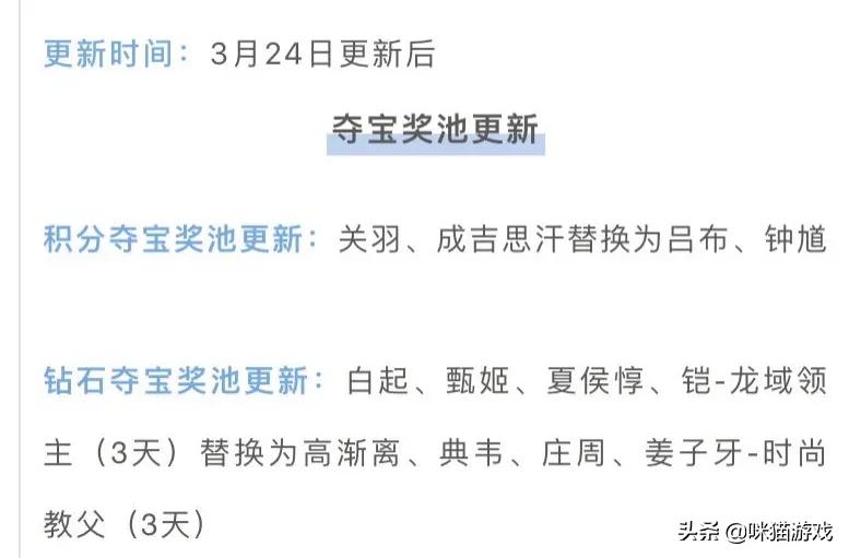 第六个活动积分夺宝,钻石夺宝奖池里面的英雄更新!目前来讲钻石夺宝里面的更新较大一些!但是两种形式的夺宝!基本上都不会参与!为什么呢!钻石夺宝奖励都有了!积分夺宝不舍得买!