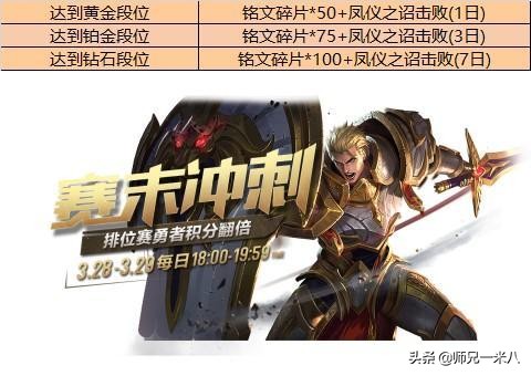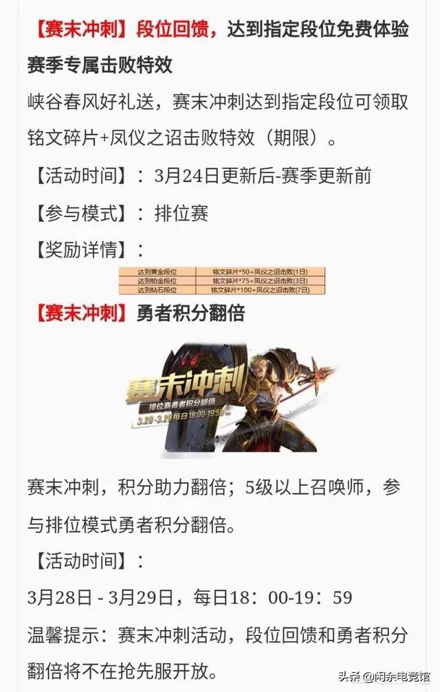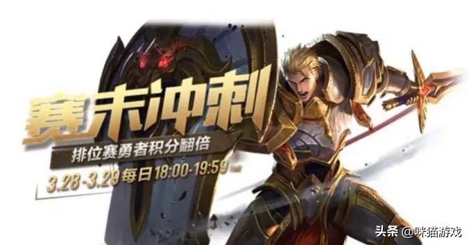 王者荣耀赛末冲刺活动将会在3月28日正式开启,直到3月29日结束,在此期间,各位玩家的排位赛勇者积分会翻倍,而且到达不同指定单位的玩家,会获得不同数量的名人碎片和时间长度不等的凤仪之诏击败特效,最短1天,最长7天,各位玩家可要抓紧上分了!