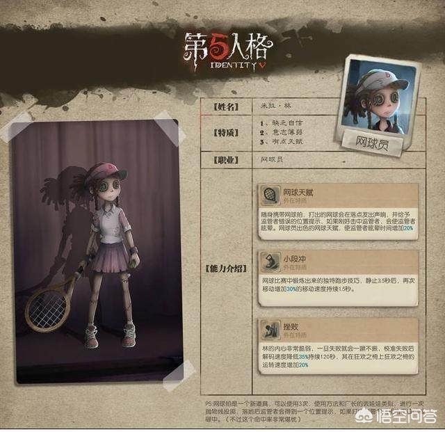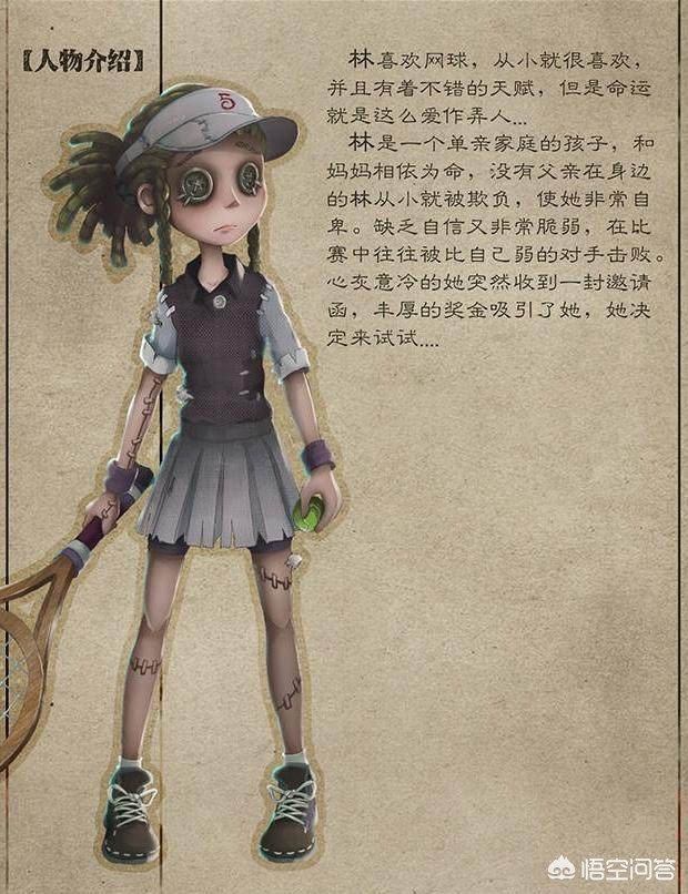 这个求生者网球员名字只有一个字,叫做“林”,从小喜欢网球,单亲家庭长大的孩子,内心有些脆弱但又很倔强,小时候经常受到别的小伙伴欺负,突然的有一天收到了一封来自于庄园的邀请函,丰富的奖金吸引了她,她决定来试试…(背景故事设定也比较简单,估计以后还有后续…)