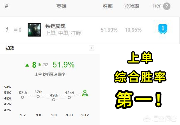 从最近几个版本的改动来看,铁男在9.7-9.11的版本中一直位于40名左右的下水道胜率,腿又短伤害又底,排位中几乎看不到。而在9.12版本重做更新了之后,这名英雄直接一跃成为Rank中非ban即选的存在!