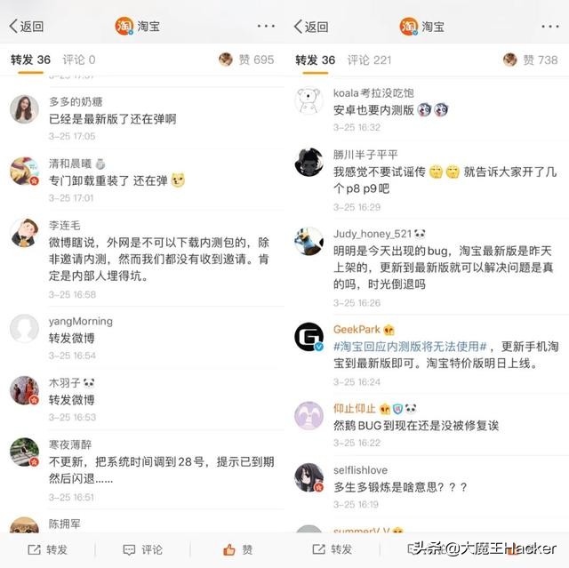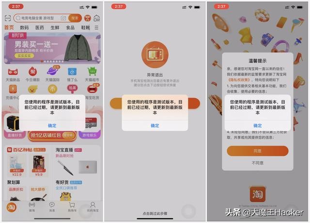 3月25日淘宝iOS版本启动后跳出一个弹窗,里面会显示当前版本会内测版,并且还会到期,这一操作最终导致很多用户卸载了当前版本并去重新安装新版,但结果会发现这个弹窗依旧,很难想象当时很多用户懵逼的状态。对于这一现象,有传言称是阿里推送错了版本,将内测版给放了出来,但事实并非如此!