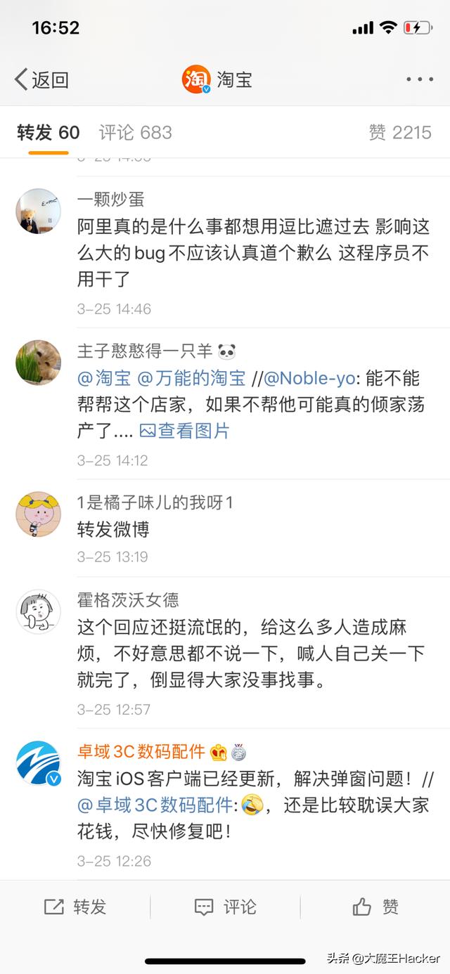 从故障的持续时间和官方微博的反馈来看,这个弹窗显然很严重,严重到竟然让阿里的诸多技术大佬束手无策无法在短期内修正,只能出台自动关闭弹窗这个临时举措。可见,淘宝这次的弹窗Bug很大很深,不花足够的时间根本找不出问题根源。