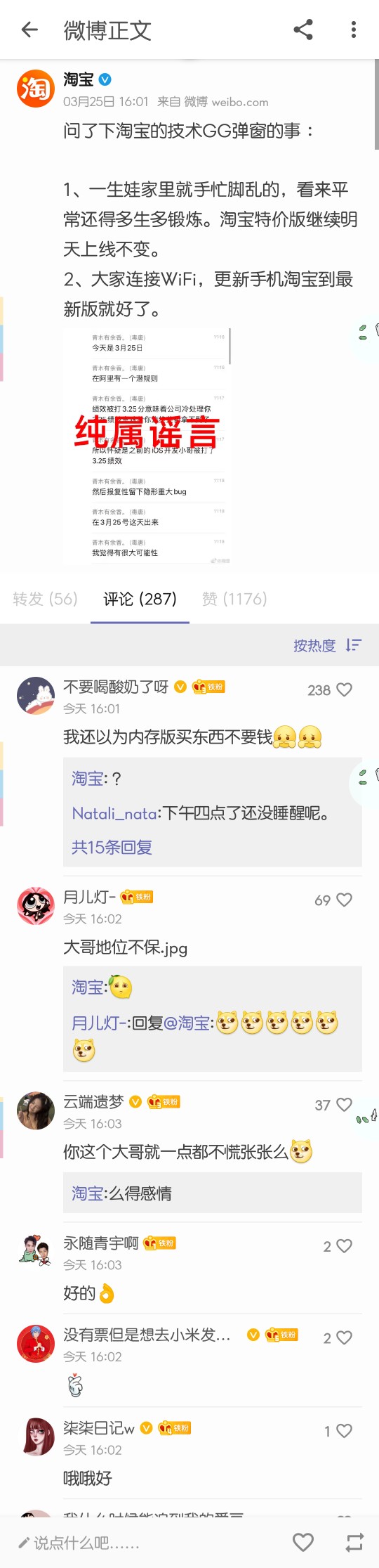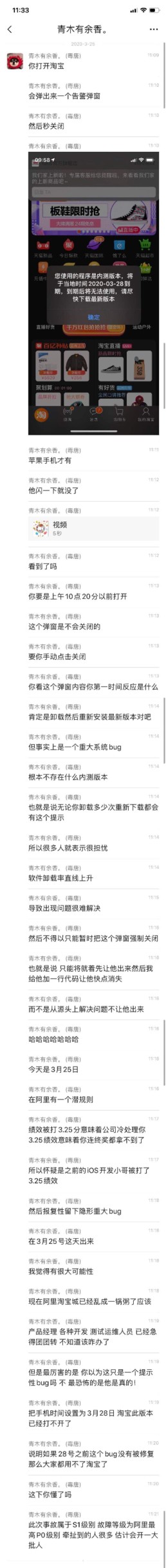 网上有消息称,此bug只出现在苹果手机端,再结合今天是3月25日,可能是iOS研发工程师因被打了325绩效(阿里潜规则,绩效中被打3.25分,意味着年终奖为0)而心生怨恨,然后报复性地在这天埋下了bug。对此,淘宝官方回应,所谓开发小哥报复传闻,纯属谣言。另外,淘宝特价版继续今天(3-26)上线不变。