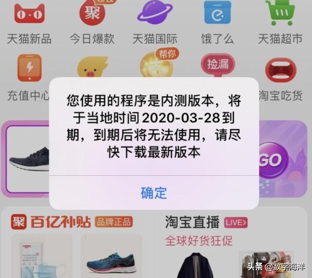 目前淘宝这件事已经在网上发酵了,如果你经常用淘宝而且你是IOS系统的话,会发现今天的淘宝总是跳出弹窗,“您使用的程序是内测版本,将于当地时间2020-03-28到期,到期后将无法使用,请尽快下载最新版本。”,而且弹窗还是一回事,它居然还会闪退,这样基本上IOS端是无法使用淘宝的,所以今天淘宝购物销售额也会稍微降低,而且出现这样的用户体验真的糟糕。