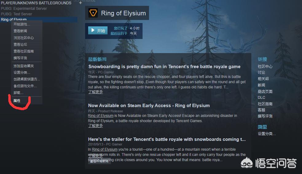 1.打开steam,单击“ring of elysium”后右击鼠标,点击属性