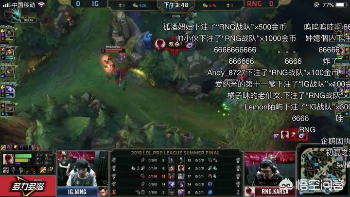 之后落后3000经济抗压,后来依靠上路一波盲僧R闪寒冰,竟然打赢了!接着中路RNG头铁被0换3!