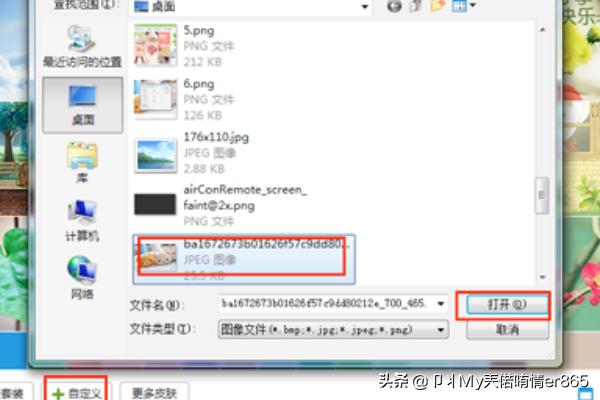 7.然后点击自定义,通过窗口选择我们刚刚保存的图片,此时我们就可以修改我们的皮肤了。当然我们可以省略步骤6,直接将一个图片在自定义中选择。