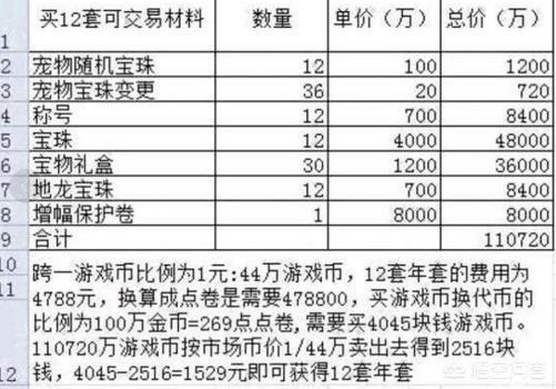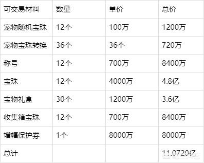 此图已经是废了,在跨一增幅保护券只卖到3700万一张,宝物礼盒1050万一个,收集箱宝珠400万一个,带宝珠称号3700一个。远远比图片上的价格低了不少,这样算下来12套能回本的还不够7亿,换成RMB可能就在1500块左右,即使让你2500包也可能亏不少。