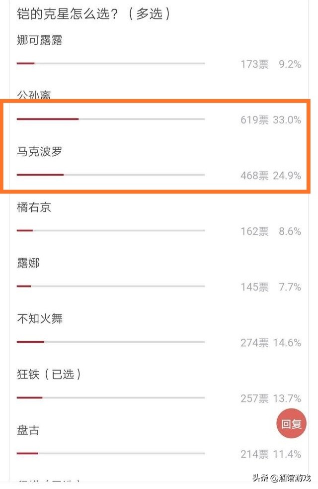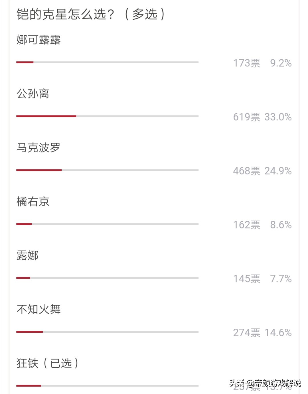 某论坛网友票选铠的克星,多数玩家认为马可波罗和公孙离是铠的克星,其中公孙离的票数占比高达33%,马可波罗为24%。从票数上来讲大多数人认为公孙离才是铠真正的克星,马可波罗次之!