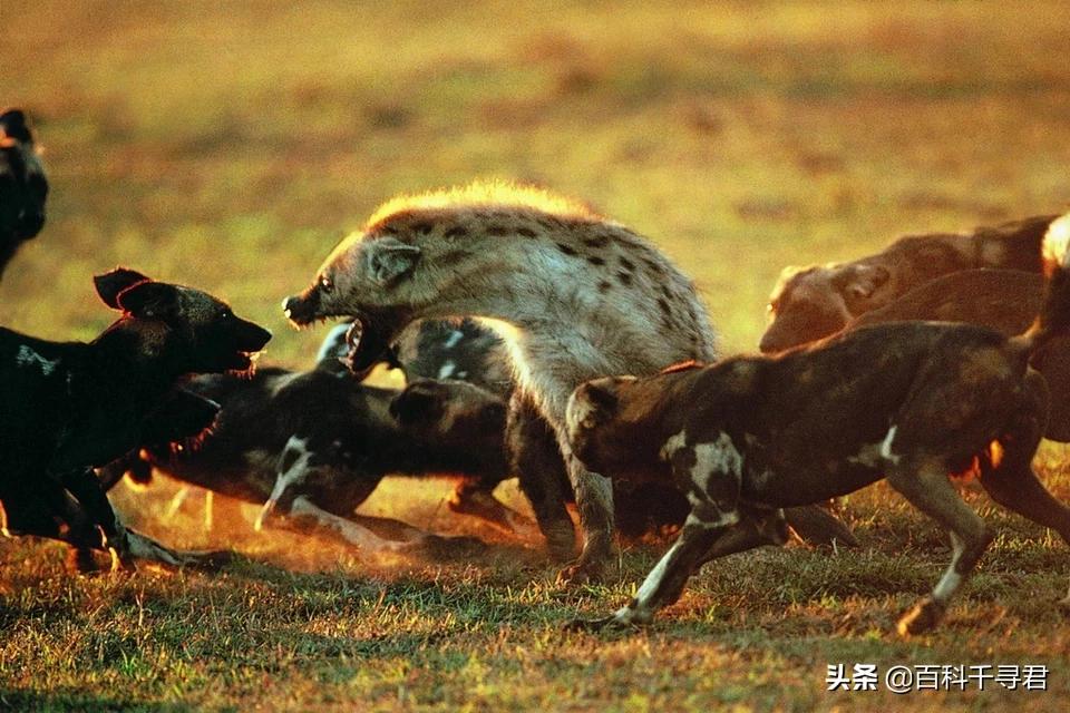 斑鬣狗虽然名为狗,但不是犬科,非洲野犬是纯正的犬科动物,这算是“假狗”与“真狗”的对抗。