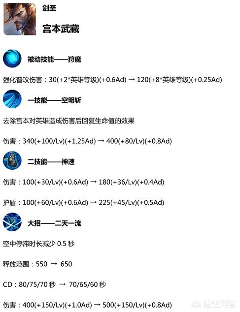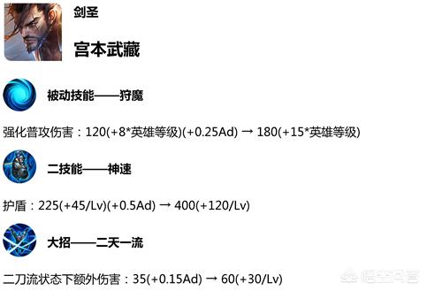 这一次宫本武藏的身板被全面加厚了,即坦度变高了很多很多,无论是基础坦度还是等级成长后提升的坦度。这意味着什么呢?这意味着接下来宫本武藏最适应技能机制,最适应版本趋势的玩法就是全肉出装了,最多也就是出个暗影战斧之后其他全部肉装。也就是说宫本武藏的定位从原先大家伙们比较熟悉的战士刺客完完全全变成了肉坦战士甚至坦克了。可能有不少有宫本武藏情怀的老玩家要难受了,这么改确实有点儿重做英雄的意思了!