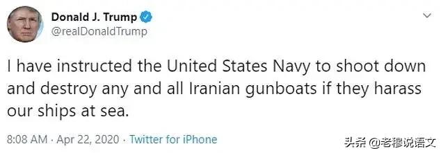 据美国CNN报道,美国总统特朗普22日在推特上发文,这样写道“我已经指令美国海军击沉和摧毁任何、全部伊朗炮艇,如果他们在海上骚扰我们的船只。”。