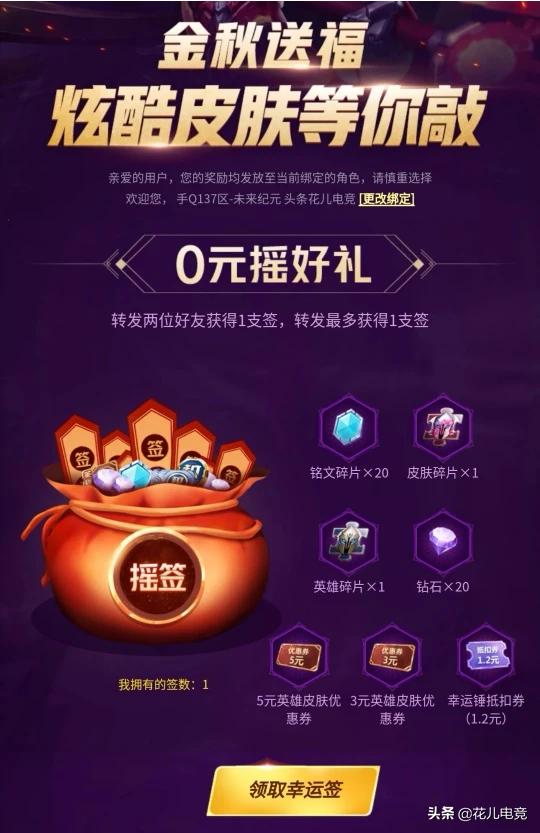 第一个活动比较一般没什么好东西,就不多说了,直接说第二个氪金活动,这个活动氪金力度很大,但是奖励也很丰富。如上图所示这个活动从 2019年10月16日14:00:00开始到2019年10月26日23:59:59结束。活动期间将活动转发给2位好友,就可以获得1支签,每个人最多可免费获1支签,摇签可以抽奖,奖池有3元、5元英雄皮肤优惠等奖励。如果抽到幸运锤抵扣券(1.2元),就可以在本页面购买幸运锤时进行抵扣。