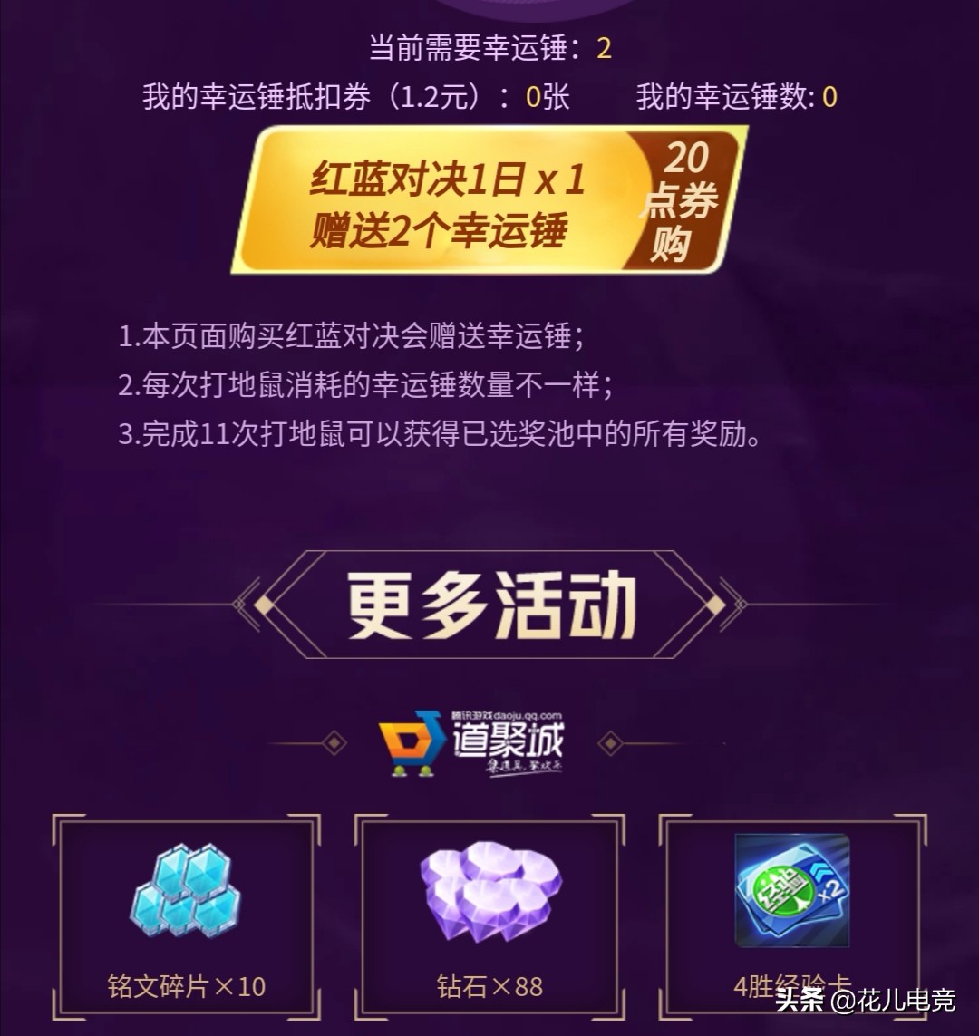 在活动页面购买红蓝对决,就可以获得不同数量的幸运锤,打地鼠消耗的幸运锤数量会逐渐递增。(2个、3个、6个、8个、10个、12个、26个、42个、64个、66个、68个)首次打地鼠奖品概率为:史诗皮肤获得概率0.03%,勇者皮肤获得概率0.1%,热门皮肤获得概率0.2%,荣耀积分获得概率0.25%,积分夺宝抵扣券获得概率0.7%,皮肤碎片获得概率3%,新品皮肤抽奖券获得概率6%,铭文碎片获得概率33%,新品英雄抽奖券获得概率56.72%。打地鼠前需要提前选好皮肤,史诗皮肤个人推荐大家选暗夜贵公子、星夜王子和鬼剑武藏,至于勇者皮肤,随便挑一款就行了。