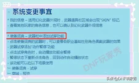 我们先来看看官网公告的系统变更事宜,其中明确提到,“装备词典的武器栏,添加武器试穿功能”,点击对应武器,就会穿在对应的职业身上,让玩家可以查看佩戴该武器的外观效果。