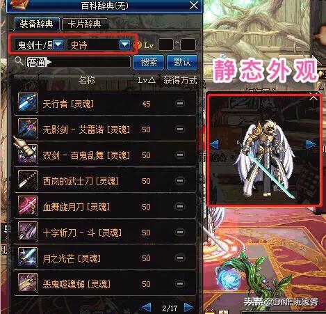 打开装备词典,秀儿以鬼剑士武器为例,任意选择一把史诗武器,在屏幕右侧,就会出现佩戴该武器的“静态外观”,按“动作暂停”按钮,可以观看任意动作下的“静态外观”!
