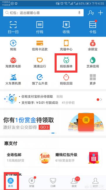 2、打开支付宝后,点击“首页”选项卡,点击“蚂蚁森林”选项。