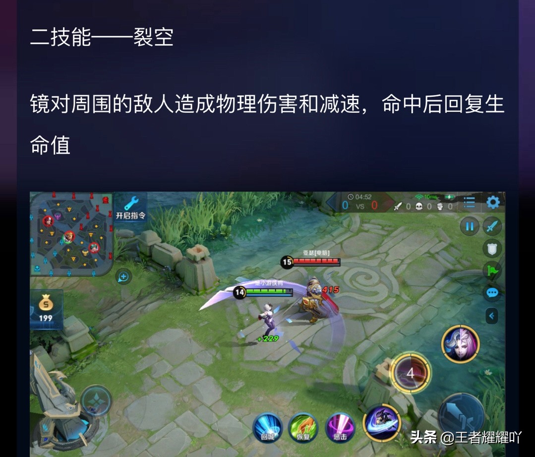 二技能裂空:其实镜这个技能是借鉴东方曜逐星技能,但是取消了圆弧位移,增加了恢复生命值的特效。从恢复血量上看,应该是以技能伤害成比例恢复。并且该技能到后期只有4秒的冷却时间,配合被动能更好地起到控制、续航效果,关键是能造成群体伤害。