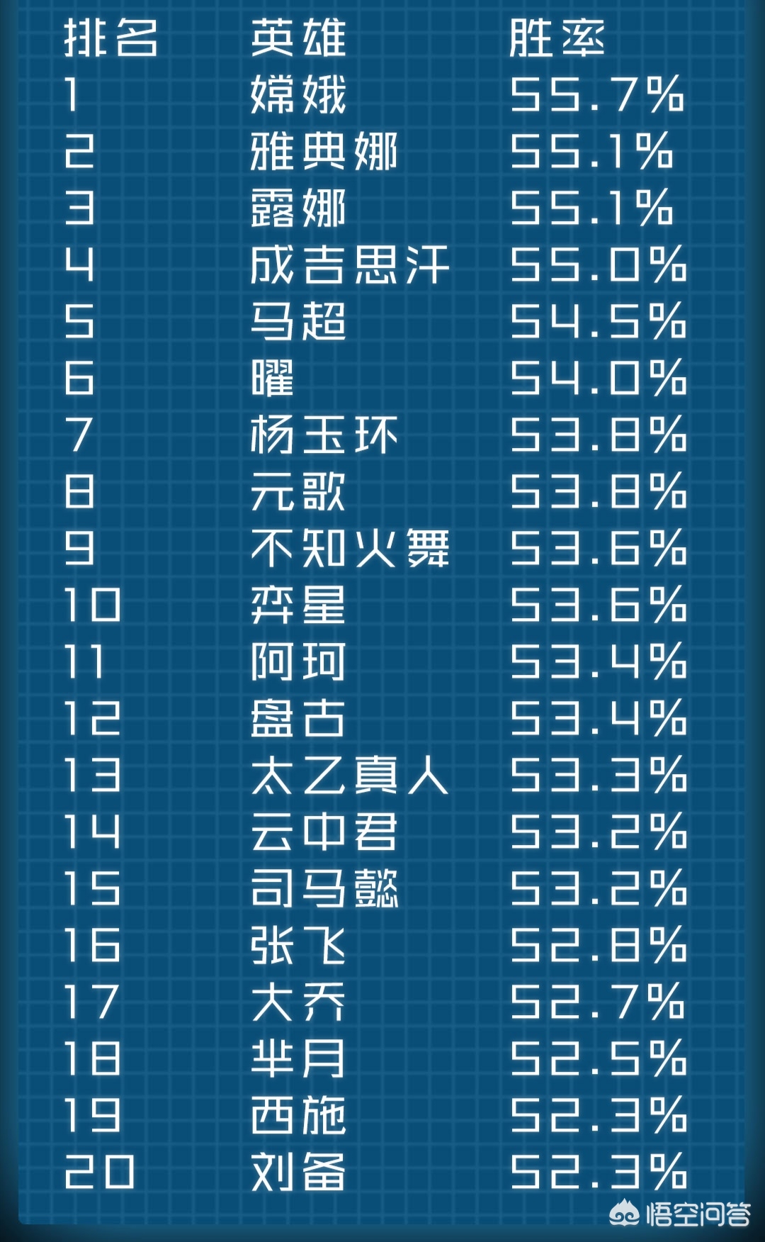 然后就是胜率为54.5%的马超,说实话,马超操作很难,但是会用的人确实厉害,灵活位移多、连续突刺回血消耗能力强、切后排能力一流、收割基本没人跑得了、单带灵活也没发抓,不过马超有明显缺点,只一个减速,前期伤害没够难以完成越塔单杀。前期没有队友帮忙边路最多压制难以形成碾压,打野就更憨憨了前期真的慢且没有疾跑。加上上次的削弱,不谈伤害的降低,主要把二连戳的手感改的极其便秘,至少攻速达到一个阈值才能和以前一样(具体是多少我不知道,但是一个攻速鞋不够)。但是不管怎么样,马超这个英雄切脆皮的能力还是非常的强,非常值得官方削弱的!